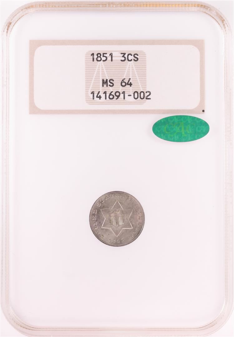 One 1851 Three Cent Silver Coin NGC MS64 CAC. NGC Certified.