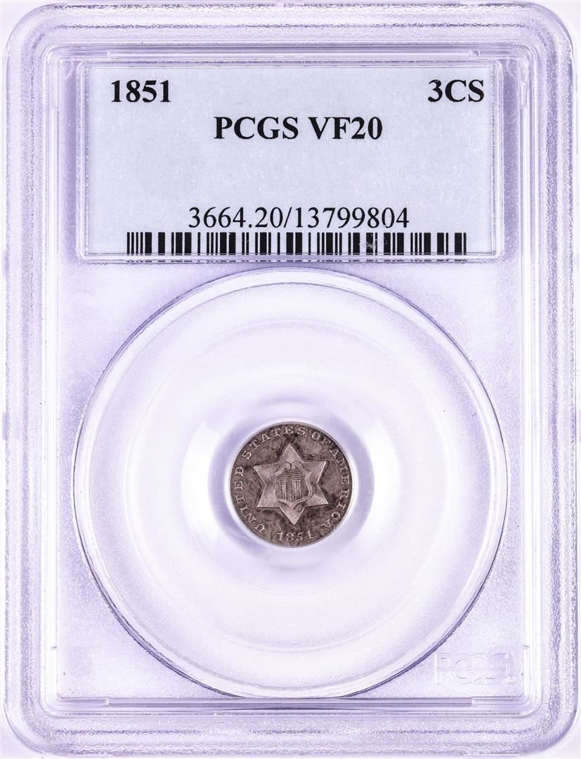 One 1851 Three Cent Silver Coin PCGS VF20. PCGS Graded.