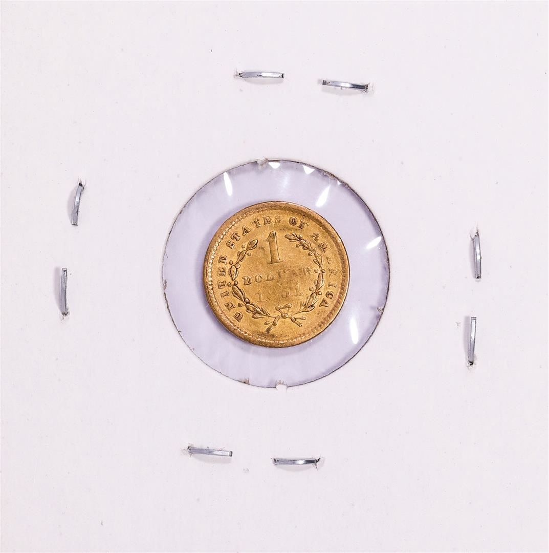 One 1851 Type 1 $1 Liberty Head Gold Dollar Coin. Please reference the included pictures and note the damage on the reverse of the coin.