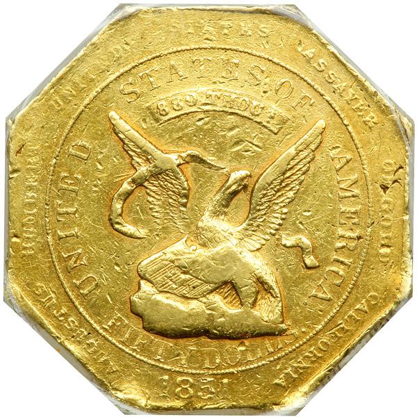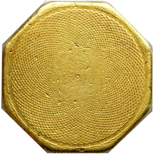 The U.S. Assay Office would produce what became the highest denomination U.S. gold coin to circulate -- octagonal-shaped $50 gold coin-ingots, often referred to as "slugs." (PCGS # 10211) .