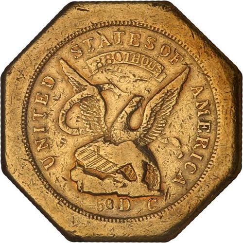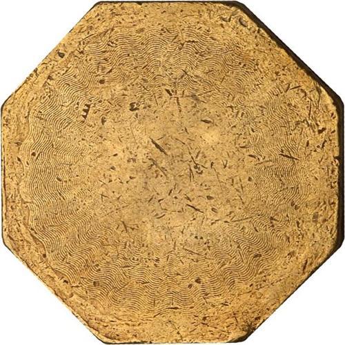 In 1851, the United States Assay Office of Gold began production using Moffat & Company's equipment, under the direction of assayer Augustus Humbert. Only fifty-dollar slugs were made in 1851. Varieties K-1 through K-4 have the 1851 date on the edge. On the ribbon, an 880 is incuse, and was also hand-punched into the coin's surface. Each edge section of this octagonal piece has individual lettering as follows: AUGUSTUS / HUMBERT / UNITED / STATES / ASSAYER / OF GOLD / CALIFORNIA / 1851. This is perhaps the only United States coinage issue with its date on the edge. This particular 880 THOUS piece is distinguished by a plain-center swirl of the engine turned reverse and is the most popularly collected style of Letter Edge $50 slug.