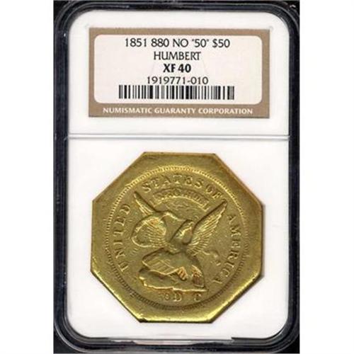 <b>1851 U.S. Assay Office $50 "slug" 887 THOUS. Lettered edge, no 50 on reverse. NGC graded EF40.</b> Still-lustrous in a few places with tinges of old-gold color in the protected areas. Abrasions are present but not overly numerous (heavy marks are typically seen on this heavy piece of territorial gold history). Furthermore, we can report there are virtually none of the more bothersome edge and corner bumps found on most of these. These large gold "slugs," or ingots as they were called represent tangible evidence of the California Gold Rush over 150 years ago. They are always admired by students of history and highly collectible today.