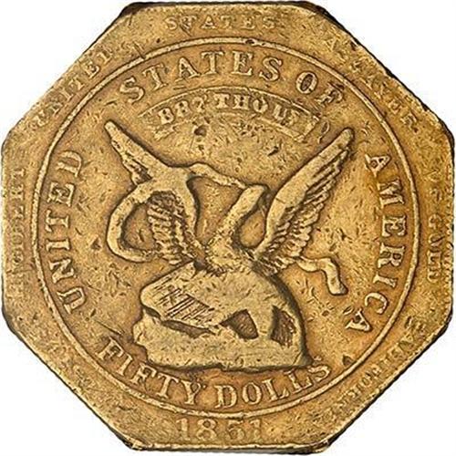 A popular reminder of the days when private minters could strike gold coins (actually these were called "ingots" and later "slugs") and find a ready market for their product. Tens of thousands of fifties were issued, and just as many, barring a few residual survivors went into the San Francisco Mint's melt pots where the gold they contained was turned into flashy double eagles and other gold denominations. A generally well preserved piece with visible lettering and a clear date, but the usual abrasions in the field and on the devices.