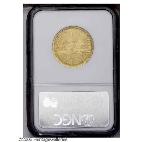 <B>1852/1<$10> Humbert Ten Dollar AU58 NGC.</B></I> K-8, High R.5. Still-lustrous with attractive reddish highlights. The central striking details on the obverse are diagnostically weak on the shield, arrows, and eagle's claws. A tiny dig is located below the right side of the scroll in the obverse field. In addition to the overdate feature, this distinctive variety is more readily recognized by a prominent die crack that runs diagonally from 12 o'clock to 5 o'clock across the reverse. These coins were struck during a four-day period between February 11 and 14 of 1852. Apparently the majority of the Humbert Tens produced were promptly placed into circulation and a handful of Mint State pieces survived. Census: 7 in 58, 5 finer (11/05). Listed on page 350 of the 2006 <I>Guide Book.</B></I><BR><I>From The Great Western Collection of Territorial Gold, Part Two.</B></I>