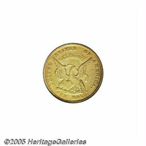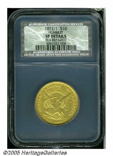 <B>1852/1<$10> Humbert Ten Dollar VF Details, Reverse Repaired, NCS.</B></I> K-8, High R.5. The reverse (legend side) field has numerous tooling pinscratches, and a few letters have been strengthened. A few pinscratches and contact marks of various severity are noted on the obverse, which is hairlined and slightly glossy from a cleaning. Many numismatists believe that the 1851 to 1853 Humbert and Assay Office pieces should be collected as official U.S. coins rather than as territorials, since they were struck under Federal authority. Listed on page 297 of the 2005 <I>Guide Book.</B></I><BR><I>From The Great Western Collection of Territorial Gold.</B></I>