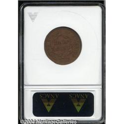 <B>1852<1/2 C> Restrike, Small Berries PR63 Brown ANACS.</B></I> B-2, R.5. This first restrike example is readily identified by the die doubled wreath ribbon and HALF CENT. Orange-brown patina dominates this razor-sharp specimen, although faint streaks of aqua iridescence are also present. The surfaces are surprisingly undisturbed, and a fully retained lamination (as made) on the reverse rim at 1 o'clock will have to suffice for a pedigree marker. <BR><BR><B>Important notice:</B> Heritage usually auctions material at the rate of 200-250 lots per hour. On some occasions eBay Live bid software or the Internet may not be able to keep up with the pace of the auction. We recommend placing a realistic absentee bid now as insurance to avoid disappointment. Occasionally the auctioneer may eliminate or reject an eBay Live bid, and the auctioneer may also reopen a lot after the close of the eBay live bidding (usually because we missed an audience bid), and may reject your bid even if it shows you as the winning bidder. By bidding via eBay Live, you agree that Heritage may award the lot to another bidder at its sole discretion under the circumstances described above or any other reasonable circumstances. Since eBay bids are not shown to us until we open the lot on the floor, we treat those bids just like floor bids. In most cases the floor responds before the eBay bid is presented to us, due to Internet lag time, so for consistency we have made it a policy that floor bids are always considered first over tie eBay live bids. Also please note that all Heritage lots purchased through eBay Live carry a 20% Buyer's Premium. Please make sure you read the Terms and Conditions before you bid.