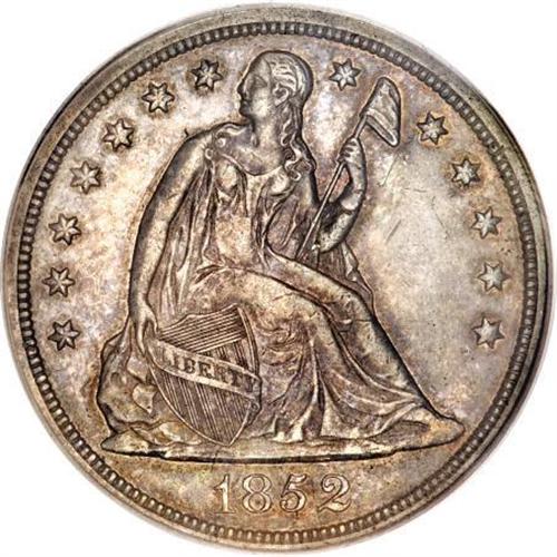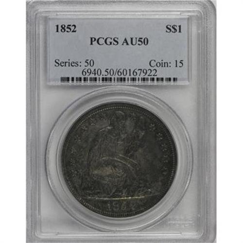 <B>1852 $1 AU50 PCGS.</B></I> Seated Liberty dollars of 1852 are among the rarest issues of the series, although those that survive are generally in high grades, more often than not a finer grade than this example. PCGS has certified a couple dozen finer examples and only nine lower grade pieces, down to XF40. We mention the data to show the importance of this coin, a desirable piece that will interest a wide range of collectors who may be unprepared for the price of a higher grade coin. Both sides have intermingled pewter and steel-gray surfaces with hints of blue and iridescent toning. Traces of luster remain and surface marks are insignificant. Population: 2 in 50, 24 finer (3/08).<BR><BR><B>Coin Engraver:</B> Christian Gobrecht<BR><BR><b>Shipping:</b> Coins & Currency (<a target="_blank" href="http://www.heritageauctions.com/common/shipping.php">view shipping information</a>)