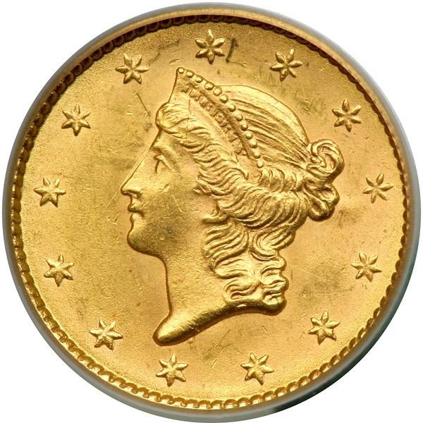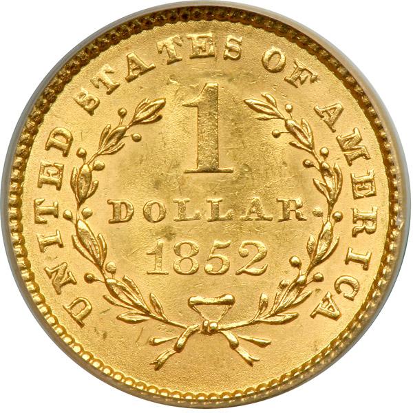 1852 $1 Gold Liberty. PCGS graded MS-63 PQ. CAC Approved. Well struck. A gold, untoned example, as crisp and lustrous as when it was first issued. Probably a good many are not as carefully struck as this piece, with no suggestion or even a whisper of weakness at the hair curls (PCGS # 7517) .