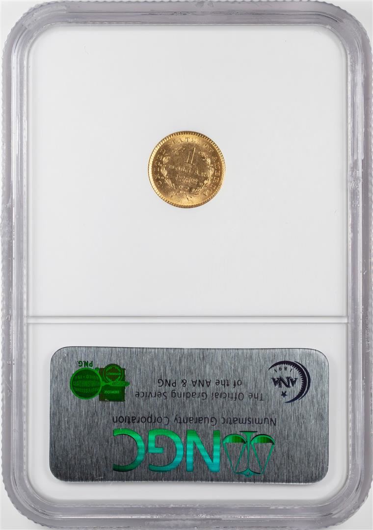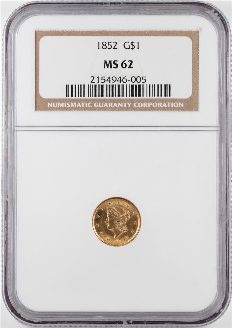 One 1852 $1 Liberty Head Gold Dollar Coin NGC MS62. NGC Certified.