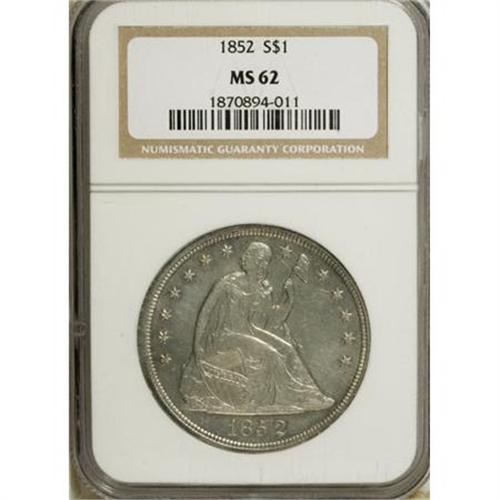 <B>1852 $1 MS62 NGC.</B></I> Aside from the proof-only 1858, the 1852 has the lowest mintage of any Philadelphia Mint Seated dollar. The mintage was just 1,100 pieces, less than any of the four rare Carson City issues. Only the non-existent 1873-S has a lower recorded business strike mintage. The 1870-S mintage was undoubtedly less than that of the 1852, but that mintage went unrecorded.<BR> The California gold rush was the reason for the uncommonly low 1852 mintage. Significant production from gold camps near San Francisco reduced the value of gold, relative to silver. But the government ratio of silver to gold was fixed. The result was that gold coins circulated, since their bullion content was undervalued relative to face. Silver coins were hoarded, and melted by speculators, since their face value was less than their intrinsic value.<BR> Production of silver coins by the Mint depended upon private deposits of bullion. But it was undesirable to deposit bullion at the Mint, and receive coins of lesser face value than what depositors could instead obtain with the raw bullion from an assayer. As a result, mintages of silver dollars fell dramatically between 1849 and 1852. Mint production of the era was instead focused on the gold dollar. Between 1851 and 1853, approximately 10 million gold dollars were struck.<BR> In 1852, there were few numismatists in the United States. The handful of collectors of the day pursued early products of the Mint, instead of contemporary issues. It is unsurprising that most surviving 1852 Seated dollars are in XF to AU grades. They circulated briefly, then were set aside because their value exceeded face. Only a single piece has been certified as high as MS65.<BR> The present example is brilliant and lacks highpoint wear. The strike is bold aside from Liberty's hair and stars 8 and 9. Marks are limited to minor contact on the right obverse field and a concealed abrasion at the base of Liberty's shield. A hint of granularity is noted above the eagle's beak. The eye appeal is pleasing for the MS62 level. An important opportunity for the advanced Seated specialist. Census: 8 in 62, 1 finer (2/08).<BR><I>From The Queller Family Collection of Silver Dollars.</B></I><BR><BR><B>Coin Engraver:</B> Christian Gobrecht<BR><BR><b>Shipping:</b> Coins & Currency (<a target="_blank" href="http://www.heritageauctions.com/common/shipping.php">view shipping information</a>)