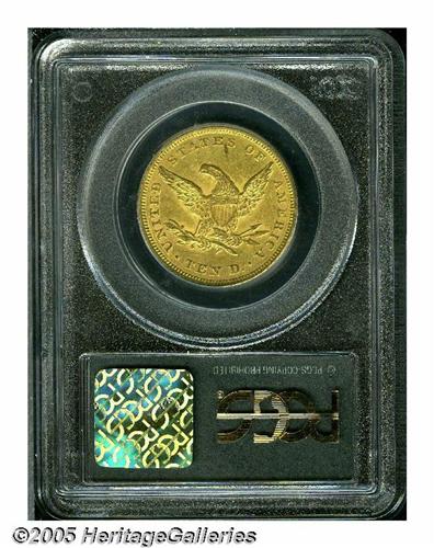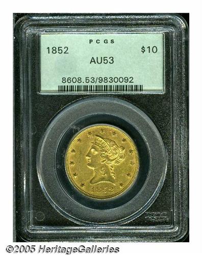 <B>1852<$10> AU53 PCGS.</B></I> Abundant luster glimmers beneath the original honey-gold toning. A nicely struck older holder example. A few small marks on the portrait and the upper reverse are appropriate for the grade.<BR><I>From The Stig Ericsson Collection.</B></I>
