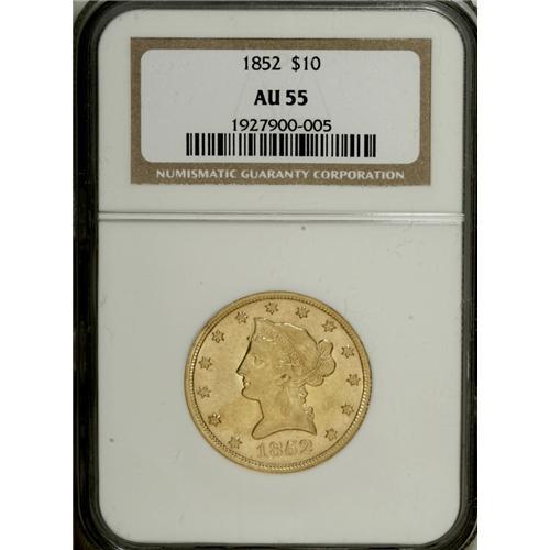 <B>1852 $10 AU55 NGC.</B></I> The pale wheat-gold fields retain much of their original luster. Softly struck with scattered abrasions and minor wear on Liberty's brow and the eagle's beak and neck.<BR><BR><b>Shipping:</b> Coins & Currency (<a target="_blank" href="http://www.heritageauctions.com/common/shipping.php">view shipping information</a>)