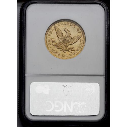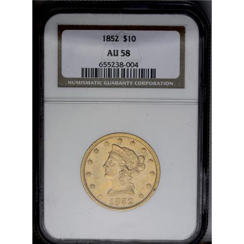 <B>1852<$10> AU58 NGC.</B></I> The major devices are sharply struck, although the stars are generally flat. Luster is ample, and the green-tan surfaces are smooth save for minor rim nicks at 4 and 10 o'clock. Struck from moderately rotated dies, and the obverse die is slightly misaligned toward 6 o'clock.