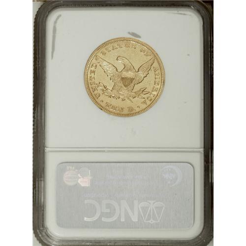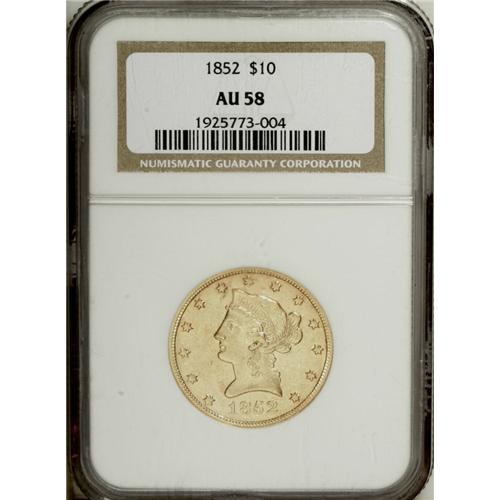 <B>1852 $10 AU58 NGC.</B></I> This straw-gold example has plenty of original luster, particularly at the periphery. Well struck and lightly abraded overall with minor friction on the ear and nose.<BR><BR><b>Shipping:</b> Coin/Currency (<a target="_blank" href="http://www.heritageauctions.com/common/shipping.php">view shipping information</a>)