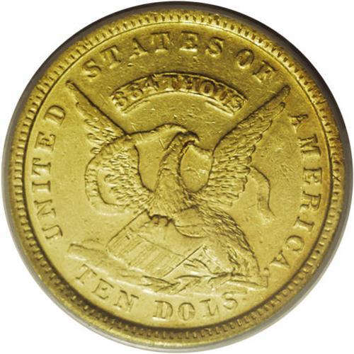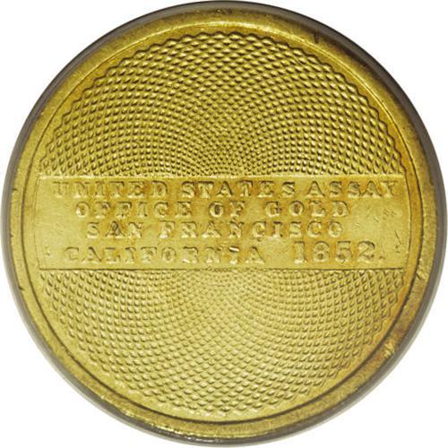 <B>1852 $10 Assay Office Ten Dollar AU53 PCGS.</B></I> Ex: S.S. Central America. SSCA 7244. K-12a, R.5. A richly defined and partly lustrous piece that has moderate marks beneath the beak and northeast of the date. Housed in a gold label PCGS holder. The reverse rim is without beads. Listed on page 351 of the 2007 <I>Guide Book.</B></I><BR><BR><b>Shipping:</b> Coins & Currency (<a target="_blank" href="http://www.heritageauctions.com/common/shipping.php">view shipping information</a>)
