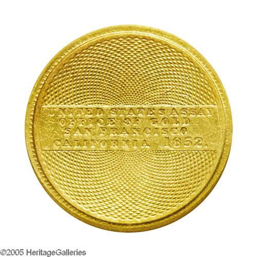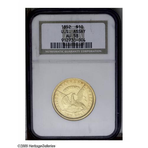 <B>1852<$10> Assay Office Ten Dollar AU58 NGC.</B></I> K-12a, R.5. With abundant, frosty luster and effulgent yellow-gold surfaces, this Territorial has the eye appeal of a Mint State grade. There is, nonetheless, some evident wear, but it is light and confined to only the highest points of the design. Sizeable abrasions are relatively few in number. Listed on page 351 of the current 2006 <I>Guide Book.</B></I>