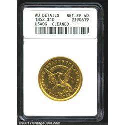 1852 $10 Assay Office Ten Dollar--Cleaned--ANACS.<p>AU Details, Net XF40. K-12a(2), R.5. Both sides exhibit green-gold color that yields to yellow-gold shades as the coin rotates into the light. This is a well detailed coin despite a little light wear with a die crack (as struck) from the left reverse rim. Glossy and unnaturally bright from the cleaning. Listed on page 291 of the 2002 Guide Book. Important notice: We expect to be auctioning lots at the rate of 200-250 per hour. Sometimes eBay Premier live bid software cannot keep up with that pace, so we strongly recommend that you place a realistic proxy bid now as insurance to avoid disappointment. Also please note that all Heritage/CAA lots purchased through eBay Premier carry a 20% Buyer's Premium.
