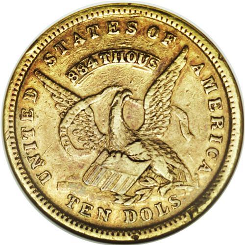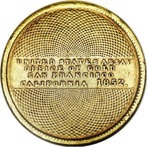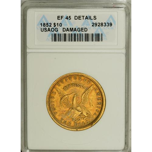 <B>1852 $10 Assay Office Ten Dollar--Damaged--ANACS. XF45 Details.</B></I> K-12a, R.5. The rim shows a couple of scrapes, one near 12 o'clock, a second near 5 o'clock, and a third smaller one near 6 o'clock, perhaps from an old mounting. The still-lustrous surfaces are antique-gold with glints of peach and ocean-blue.<BR><BR><b>Shipping:</b> Coin/Currency (<a target="_blank" href="http://www.heritageauctions.com/common/shipping.php">view shipping information</a>)