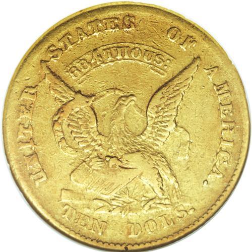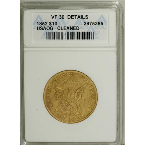 <B>1852 $10 Humbert Ten Dollar--Cleaned--ANACS. VF30 Details.</B></I> K-10a, Low R.4. ANACS has inaccurately certified this piece as "USAOG," which implies K-12 or K-12a. A nicely detailed but hairlined example of this popular and collectible pioneer gold variety. The borders have hints of rose patina. Listed on page 350 of the 2007 <I>Guide Book.</B></I><BR><BR><b>Shipping:</b> Coins & Currency (<a target="_blank" href="http://www.heritageauctions.com/common/shipping.php">view shipping information</a>)