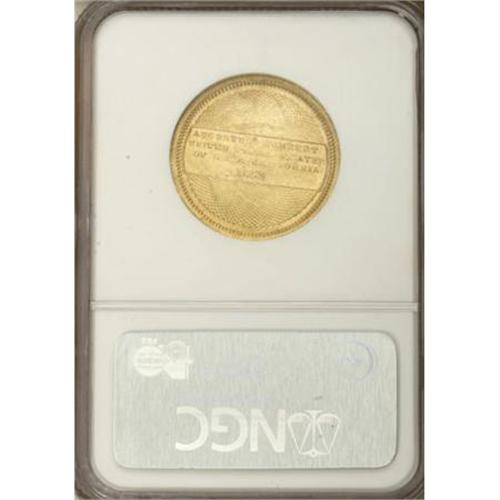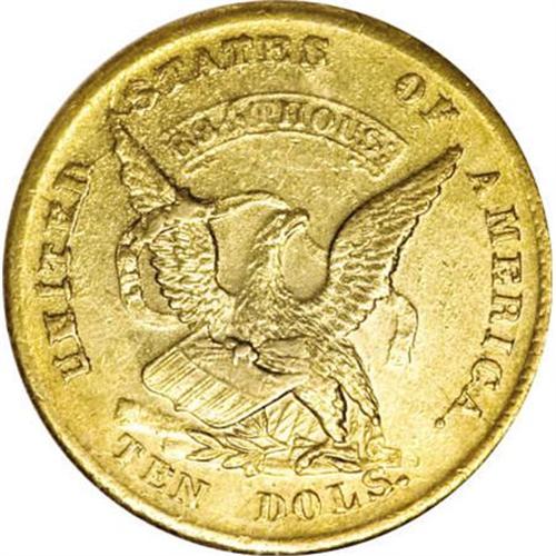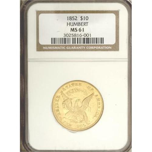 <B>1852 $10 Humbert Ten Dollar MS61 NGC.</B></I> K-10a, High R.6. Ranked among the more commonly seen issues of California gold pieces overall, but the K-10 variety of the 1852 Humbert ten dollar is conditionally rare in Mint State grades. The late die state of K-10 is given the K-10a designation by Kagin, and is known as the IINITED variety due to the heavy die crack through the base of UNITED. The late state piece offered here has a shattered obverse die with extensive cracks around the entire circumference, along with severe die rust that covers the entire obverse surface. Listed on page 355 of the 2008 <I>Guide Book</B></I>. Census: 2 in 61, 1 finer (11/07).<BR><I>From The Madison Collection.</B></I><BR><BR><b>Shipping:</b> Coins & Currency (<a target="_blank" href="http://www.heritageauctions.com/common/shipping.php">view shipping information</a>)