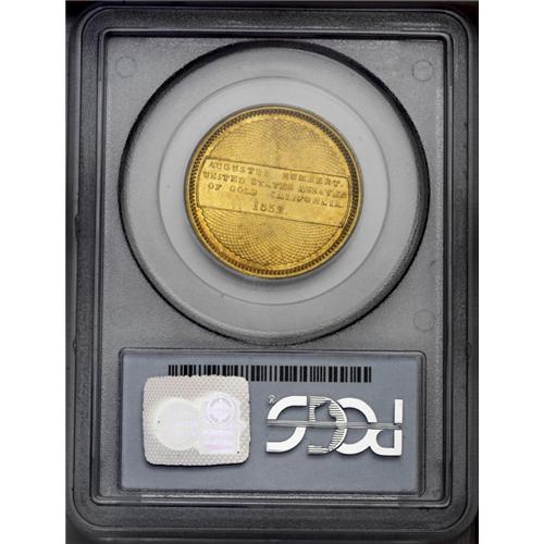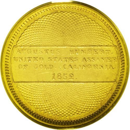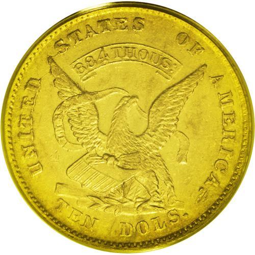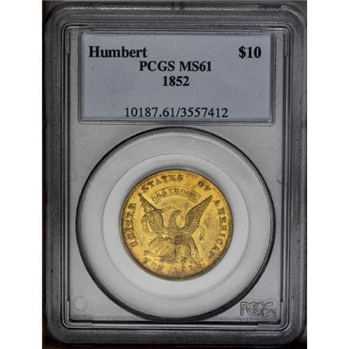 <B>1852<$10> Humbert Ten Dollar MS61 PCGS.</B></I> K-10, R.5. After Congress approved an official U.S. Assay Office in San Francisco, Augustus Humbert was appointed as the Assayer, and the firm of Moffat & Company was awarded the contract for coinage, perhaps under questionable circumstances, as pointed out by Donald Kagin: "Moffat & Company petitioned for and received the contract for coining the new issues of the U.S. Assay Office and, in a letter to Treasury Secretary Corwin, Moffat made the dubious statement that his company alone was then (September 30, 1850) operating a mint in California. Augustus Humbert, a watchmaker in New York, was appointed United States Assayer with a salary of $5,000 a year, while sculptor and medalist Charles C. Wright was commissioned to engrave in New York the original dies which Humbert was to bring with him to California."<BR> This Mint State example is fully lustrous with excellent green-gold surfaces and attractive orange toning. The fields, especially on the reverse, have a reflective appearance. The central obverse and reverse have strong design definition. The obverse die shows a heavy crack at the base of UNITED and a lighter crack through the base of STATES. Listed on page 350 of the 2007 <I>Guide Book.</B></I><BR><I>From The Long Beach Family Collection.</B></I>