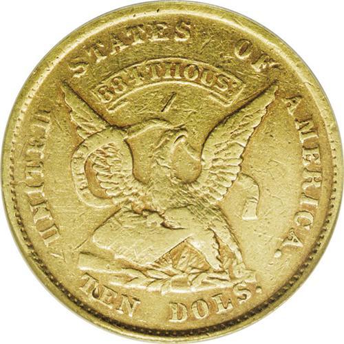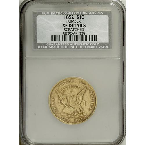 <B>1852 $10 Humbert Ten Dollar--Scratched--NCS. XF Details.</B></I> K-10, R.5. Original orange toning accompanies protected areas. A horizontal pinscratch beneath the first line of the reverse legend confirms the NCS designation, and the reverse has a minor rim bruise at 7:30. The eagle's plumage retains ample detail. An authentic souvenir of the California gold rush era. Listed on page 350 of the 2007 <I>Guide Book.</B></I><BR><BR><b>Shipping:</b> Coin/Currency (<a target="_blank" href="http://www.heritageauctions.com/common/shipping.php">view shipping information</a>)