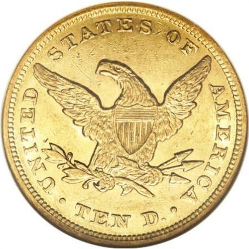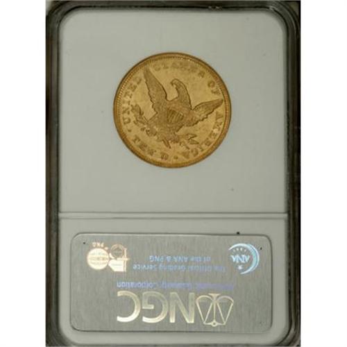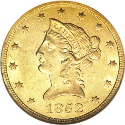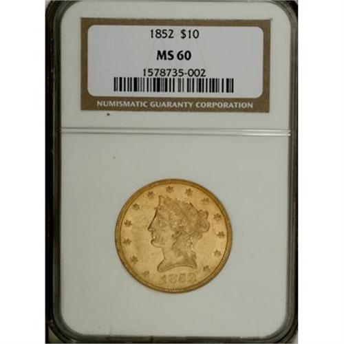 <B>1852 $10 MS60 NGC.</B></I> The 1852 has a deceptively large mintage for a No Motto ten, apparently the vast majority of the 263,106 pieces struck entered circulation. AU coins are scarce and Uncirculated pieces especially so. This coin shows strong central details with weak definition on the obverse stars. Rich orange-gold color throughout.<BR><BR><B>Coin Engraver:</B> Christian Gobrecht<BR><BR><b>Shipping:</b> Coins & Currency (<a target="_blank" href="http://www.heritageauctions.com/common/shipping.php">view shipping information</a>)