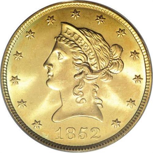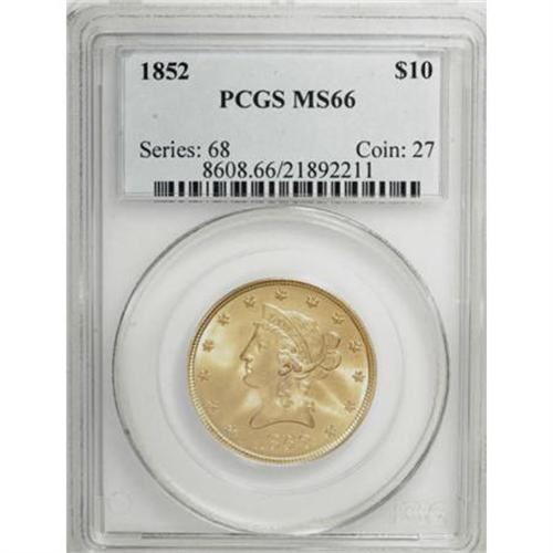 <B>1852 $10 MS66 PCGS.</B></I> This coin is simply a marvelous condition rarity, one of those phenomenal coins that is completely at odds with the typical population and in theory should not exist! In his still-valuable 1980 reference, David Akers writes of the 1852 eagle, "The mintage of the 1852 is fairly high by No Motto Eagle standards and almost identical to that of the 1851-O which is only a moderately scarce date. However, the 1852 is very scarce in all grades and rare in AU condition. In full mint state it is very rare and I have seen only two uncirculated examples that I called 'choice' along with three or four others of average (bagmarked) quality. The 1852 is similar in overall rarity to the 1848 and more rare than the 1847, 1847-O, 1849, 1850, 1851-O and 1853. It is certainly not the 'common date' type coin the mintage and the standard pricing guides would lead one to believe."<BR> More recently Garrett and Guth, in their 2006 gold <I>Encyclopedia,</B></I> note that "the 1852 eagle is a relatively common date, but nowhere near as common as the mintage indicates. For instance, the population (all major services combined) of the 1852 is only 699 coins versus over 1,000 for the 1851-O--yet the two dates have nearly identical mintages. Extremely Fine and AU coins are scarce, and Mint State examples are downright rare. <B>The terminal grade for this date would have been MS-62 except for an incredible PCGS MS-66 coin (one of the three finest No Motto eagles of any date; this remarkable coin was sold as a PCGS MS-65 in January 2005 for $130,410)!"</B></I> (Emphasis ours.)<BR> A Heritage cataloger, writing in late 2004 when this coin was graded a "mere" MS65, had this to say about the coin: <BR> "Where does one start when they have just seen one of the nicest No Motto eagles in existence? This mesmerizing 1852 ten dollar comes from a comparatively high original mintage of 263,106 pieces, but important gold collections have been known to contain nothing higher than an AU example and even an average Mint State representative is legitimately scarce. Perhaps the best way to illustrate the importance of this offering is cite census data for the issue. A total of 42 coins have been certified MS60 or better by the two major grading services, a figure that probably includes at least eight to 10 resubmissions. Of this total, a mere 17 pieces qualified at the MS62 level and above that just one coin achieved a higher grade, this amazing MS65.<BR> "Endowed with a needle-sharp strike and bountiful, billowy luster, the surfaces have acquired a touch of reddish patina overall along with tinges of olive at the margins. A few discreet blemishes in the left obverse field barely graze the satiny luster, and a relatively inoffensive mark on Liberty's neck is perhaps the only mentionable distraction. Picking a favorite coin from the star-studded Gold Rush Collection is arguably an impossible task, but this amazing 1852 eagle, the finest certified by three points, certainly makes the final cut."<BR> Since those sentences were written, the coin has been resubmitted and achieved an MS66 grade, so it is now the finest known by four points. The total Mint State pieces at NGC and PCGS combined have surged to 69 (amazing the effect a world-record price can create in revealing uncertified coins), including 29 MS62 PCGS coins and five more at NGC that are the next-highest; but the MS66 (ex-65) specimen in the present lot continues to stand alone, a miraculous wonder coin. Interestingly, while the number of certified Mint State 1852s at PCGS has increased since the 2005 sale, the number of No Motto eagles certified MS66 has not: as of (11/07) PCGS has certified precisely three MS66 pieces: the present 1852, an 1848-O, and an 1861. (NGC has certified a single 1848-O in MS66.) PCGS population: 29 in 62, one finer (the present MS66 coin).<BR><I>Ex: The Gold Rush Collection; Heritage FUN Signature Sale 360 (1/2005), lot 30057, which brought $130,410.<BR>From The Madison Collection.</B></I><BR><BR><B>Coin Engraver:</B> Christian Gobrecht<BR><BR><b>Shipping:</b> Coins & Currency (<a target="_blank" href="http://www.heritageauctions.com/common/shipping.php">view shipping information</a>)