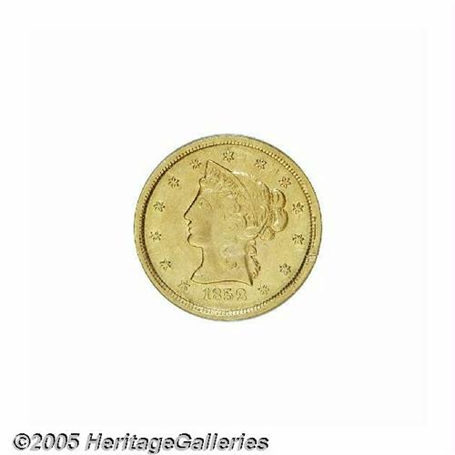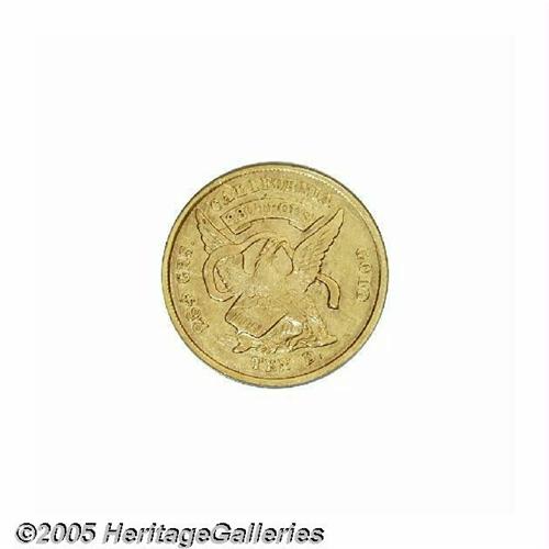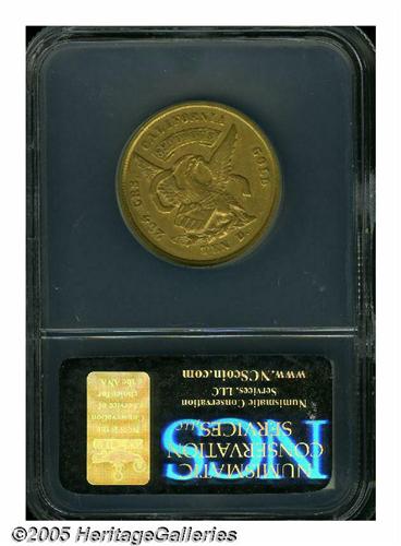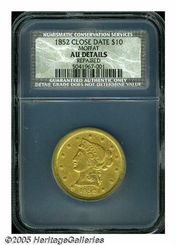 <B>1852<$10> Moffat & Co. Ten Dollar Repaired, AU Details, NCS.</B></I> K-9, R.6. This is the Wide Date variety, although incorrectly identified by NCS as a Close Date example. The wide spacing between the 5 and the 2 is the easiest diagnostic. The Moffat & Co. firm was among the earliest of private coiners in California, and they were also one of the most prolific of issuers. Local businessmen in San Francisco approached Moffat & Co. with a need for small coinage. In response, the company issued 8,650 of these coins in the early part of the year. The reverse is inscribed 264 grains and 880 fine, for a net of 232.3 grains pure gold, or about 1/10th of a grains more than a Federal ten-dollar piece. This is a pleasing example with light yellow coloration and considerable retained luster. The repair mentioned by NCS is located on the right obverse rim and at Liberty's neck.<BR><I>From The Great Western Collection of Territorial Gold.</B></I>