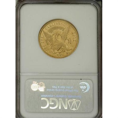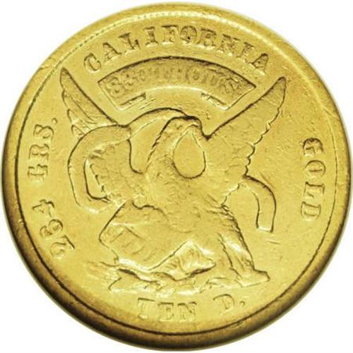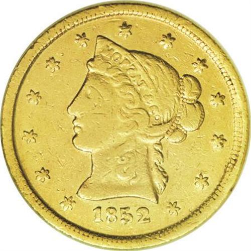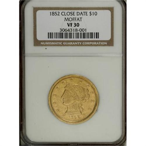 <B>1852 $10 Moffat & Co. Wide Date Ten Dollar VF30 NGC.</B></I> K-9, R.6. Incorrectly designated as "Close Date" (which would be K-8) on the NGC insert. Moffat & Co. operated the U.S. Assay Office, but that facility was unable to issue denominations of less than fifty dollars until later in 1852. Moffat & Co. met the demand for a ten dollar gold coin by striking it under their own name, which was legal prior to 1864. A typical strike affects the sharpness, but this green-gold example retains glimpses of mint luster. Distributed small marks are as expected given moderate circulation. Listed on page 354 of the 2008 <I>Guide Book</B></I>.<BR><BR><b>Shipping:</b> Coins & Currency (<a target="_blank" href="http://www.heritageauctions.com/common/shipping.php">view shipping information</a>)
