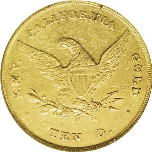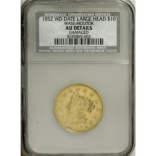<B>1852 $10 Wass Molitor Ten Dollar, Large Head, Wide Date--Damaged--NCS. AU Details.</B></I> K-4, R.5. Sharply struck and generally lustrous with only a hint of wear on the eagle's shield. Only lightly cleaned, but both sides have several thin scratches, and the obverse border is rough near 3 and 7 o'clock. Wass Molitor gold pieces are few and far between. Listed on page 357 of the 2007 <I>Guide Book.</B></I><BR><BR><b>Shipping:</b> Coin/Currency (<a target="_blank" href="http://www.heritageauctions.com/common/shipping.php">view shipping information</a>)