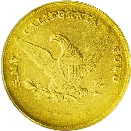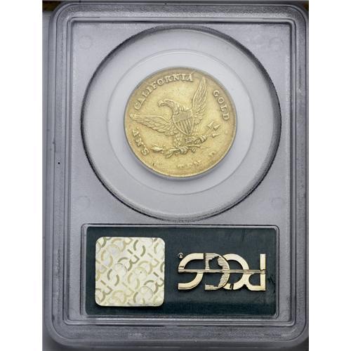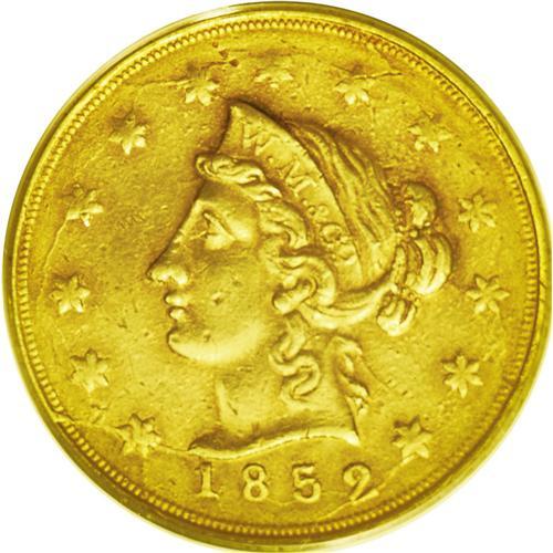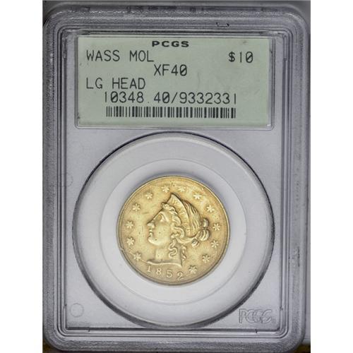 <B>1852<$10> Wass Molitor Ten Dollar, Large Head XF40 PCGS.</B></I> K-4, R.5. Large Head, Wide Date. A partly lustrous representative of this respected private gold coiner. The types are bold and evenly struck. The fields have an orange peel texture, as made, and are only lightly marked. From late dies, with peripheral cracks and crumbling. Encased in an older green label holder. Listed on page 357 of the 2007 <I>Guide Book.</B></I><BR><I>From The Carolina Gold Collection, Part Four.</B></I>