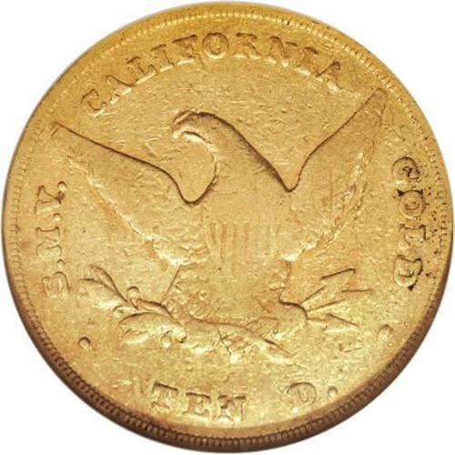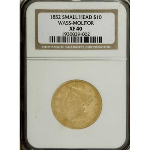 <B>1852 $10 Wass Molitor Ten Dollar, Small Head XF40 NGC.</B></I> Small Head. K-3, R.7. This is a very rare variety at all grade levels. The reverse die for this elusive Wass, Molitor piece was purchased in late 1851 from Dubosq & Co., where it had been used to strike an 1850 ten dollar issue. The obverse design resembles that of the regular U.S. Liberty Head gold eagle, except that the inscription on Liberty's crown reads: "W.M. & Co." This piece is typically softly struck, as always, with pastel peach and lime-gold coloration and scattered small abrasions on each side. A special opportunity for the advanced specialist to acquire a high grade example of this rare territorial gold issue. Listed on Page 361 of the 2008 <I>Guide Book</B></I>.<BR> <BR><BR><b>Shipping:</b> Coins & Currency (<a target="_blank" href="http://www.heritageauctions.com/common/shipping.php">view shipping information</a>)