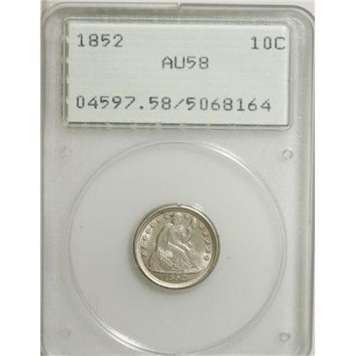 <B>1852 10C AU58 PCGS.</B></I> PCGS Population (3/78). NGC Census: (14/55). Mintage: 1,535,500. Numismedia Wsl. Price for NGC/PCGS coin in AU58: $140. (#4597)<BR><BR><b>Shipping:</b> Coins & Currency (<a target="_blank" href="http://www.heritageauctions.com/common/shipping.php">view shipping information</a>)