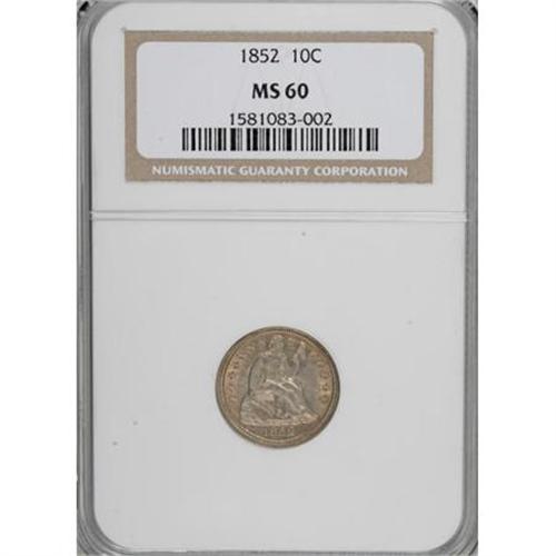 <B>1852 10C MS60 NGC.</B></I> NGC Census: (0/54). PCGS Population (1/79). Mintage: 1,535,500. Numismedia Wsl. Price for NGC/PCGS coin in MS60: $196. (#4597)<BR><BR><B>Coin Engraver:</B> Christian Gobrecht<BR><BR><b>Shipping:</b> Coins & Currency (<a target="_blank" href="http://www.heritageauctions.com/common/shipping.php">view shipping information</a>)