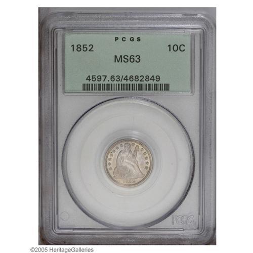 1852 10C MS63 PCGS. While not readily evident, pastel 1852[10C] MS63 PCGS.