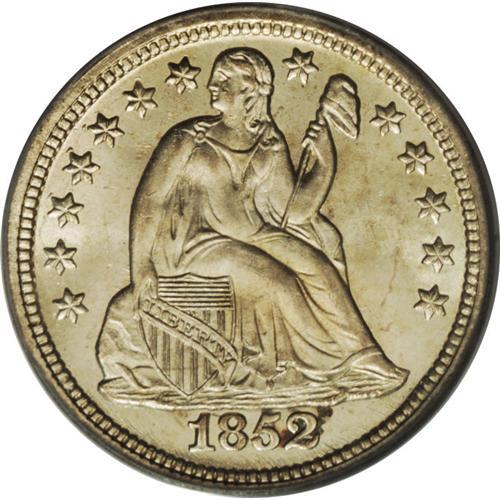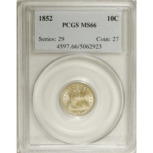 <B>1852 10C MS66 PCGS.</B></I> The observer is immediately drawn to both the sharpness of detail and the brilliant, frosty surfaces that display only a hint of golden-brown toning and some deeper shading at the 2 in the date. Exceptionally clean with only a couple of tiny luster grazes in the obverse fields. This issue is relatively common in lower grades, but anything finer than a Gem is a condition rarity. Population: 2 in 66, 2 finer (3/07).<BR><BR><b>Shipping:</b> Coins & Currency (<a target="_blank" href="http://www.heritageauctions.com/common/shipping.php">view shipping information</a>)