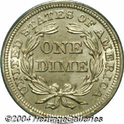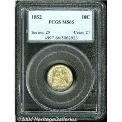 <B>1852<10C> MS66 PCGS.</B></I> The observer is immediately drawn to both the sharpness of detail and the brilliant, frosty surfaces that display only a hint of golden-brown toning and some deeper shading at the 2 in the date. There are relatively few abrasions, the only readily evident ones being a couple of minor luster grazes in the fields, one on each side of Liberty. This issue is relatively common in lower grades, but becomes a great rarity at the MS66 level or finer. Population: 2 in 66, 2 finer (9/04). <BR><BR><B>Important notice:</B> Heritage usually auctions material at the rate of 200-250 lots per hour. On some occasions eBay Live bid software or the Internet may not be able to keep up with the pace of the auction. We recommend placing a realistic absentee bid now as insurance to avoid disappointment. Occasionally the auctioneer may eliminate or reject an eBay Live bid, and the auctioneer may also reopen a lot after the close of the eBay live bidding (usually because we missed an audience bid), and may reject your bid even if it shows you as the winning bidder. By bidding via eBay Live, you agree that Heritage may award the lot to another bidder at its sole discretion under the circumstances described above or any other reasonable circumstances. Since eBay bids are not shown to us until we open the lot on the floor, we treat those bids just like floor bids. In most cases the floor responds before the eBay bid is presented to us, due to Internet lag time, so for consistency we have made it a policy that floor bids are always considered first over tie eBay live bids. Also please note that all Heritage lots purchased through eBay Live carry a 20% Buyer's Premium. Please make sure you read the Terms and Conditions before you bid.
