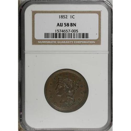 <B>1852 1C AU58 NGC.</B></I> NGC Census: (55/576). PCGS Population (44/322). Mintage: 5,063,094. Numismedia Wsl. Price for NGC/PCGS coin in AU58: $130. (#1898)<BR><BR><b>Shipping:</b> Coins & Currency (<a target="_blank" href="http://www.heritageauctions.com/common/shipping.php">view shipping information</a>)