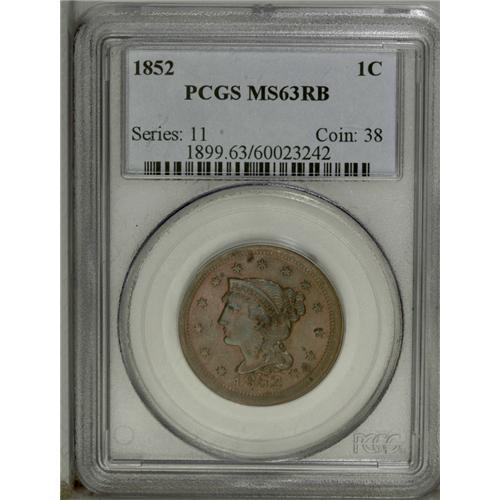1852 1C MS63 Red and Brown PCGS. N-7, Grellman Die Sta