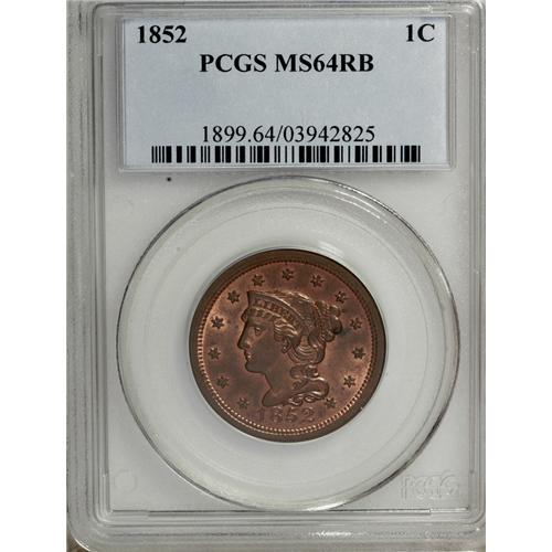 <B>1852 1C MS64 Red and Brown PCGS.</B></I> Ex: November 1981, Coin Galleries Sale, Lot:1513. PCGS Population (98/68). NGC Census: (58/93). Mintage: 5,063,094. Numismedia Wsl. Price: $376. (#1899)<BR><BR><b>Shipping:</b> Coins & Currency (<a target="_blank" href="http://www.heritageauctions.com/common/shipping.php">view shipping information</a>)