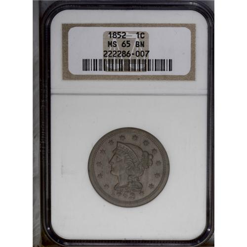 <B>1852<1C> MS65 Brown NGC.</B></I> N-18, R.3. GDS b. A needle-sharp golden-brown Gem whose quality is unassailable despite a couple of tiny marks concealed on the date digits. The obverse field is mildly prooflike. EAC 60. <BR><BR><B>Important notice:</B> Heritage usually auctions material at the rate of 200-250 lots per hour. On some occasions eBay Live bid software or the Internet may not be able to keep up with the pace of the auction. We recommend placing a realistic absentee bid now as insurance to avoid disappointment. Occasionally the auctioneer may eliminate or reject an eBay Live bid, and the auctioneer may also reopen a lot after the close of the eBay live bidding (usually because we missed an audience bid), and may reject your bid even if it shows you as the winning bidder. By bidding via eBay Live, you agree that Heritage may award the lot to another bidder at its sole discretion under the circumstances described above or any other reasonable circumstances. Since eBay bids are not shown to us until we open the lot on the floor, we treat those bids just like floor bids. In most cases the floor responds before the eBay bid is presented to us, due to Internet lag time, so for consistency we have made it a policy that floor bids are always considered first over tie eBay live bids. Also please note that all Heritage lots purchased through eBay Live carry a 20% Buyer's Premium. Please make sure you read the Terms and Conditions before you bid. This lot is being auctioned in conjunction with a live floor auction by Heritage Galleries & Auctioneers. All final auction and invoice information will be supplied by Heritage Galleries & Auctioneers, and all other information should be considered preliminary. Lot:322 <BR><BR><B>Winning Notification and Billing:</B> After the FINAL session in this auction is complete, Heritage will send e-mail and snail mail invoices. This process normally takes several days. All final auction and invoice information will be supplied by Heritage Galleries & Auctioneers, and all other information should be considered preliminary. <BR><BR>This auction will be conducted on a live auction floor and over the Internet through eBay Live. If you choose to place an absentee bid, please take a moment to <font color='#0000ff'><u><a href='http://pages.ebay.com/liveauctions/help/before/laabsentee.html'>learn how eBay Live absentee bidding works</a></u></font><font color='#000000'>