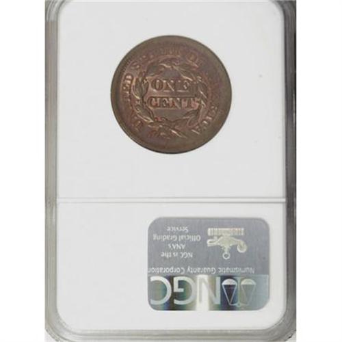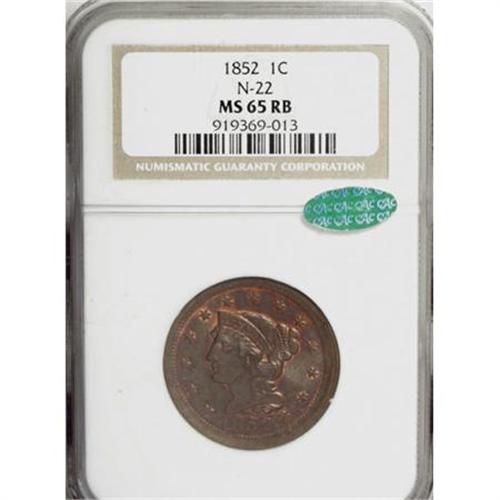 <B>1852 1C MS65 Red and Brown NGC. CAC.</B></I> N-22, R.1. A delightful example with exceptional eye appeal. Pleasing bluish-brown coloration combines with deep orange mint luster. From a late die state with very heavy obverse flowlines radiating from the center, with the reverse also showing faint flowlines in the fields. EAC 63.<BR><BR><B>Coin Engraver:</B> Christian Gobrecht<BR><BR><b>Shipping:</b> Coins & Currency (<a target="_blank" href="http://www.heritageauctions.com/common/shipping.php">view shipping information</a>)