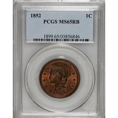 <B>1852 1C MS65 Red and Brown PCGS.</B></I> PCGS Population (63/5). NGC Census: (62/31). Mintage: 5,063,094. Numismedia Wsl. Price for NGC/PCGS coin in MS65: $850. (#1899)<BR><BR><b>Shipping:</b> Coins & Currency (<a target="_blank" href="http://www.heritageauctions.com/common/shipping.php">view shipping information</a>)