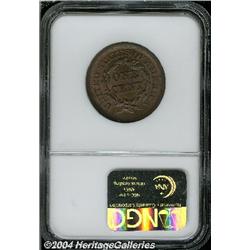 <B>1852<1C> MS66 Brown NGC.</B></I> N-17, R.1. Light blended rose and lilac patina. This shimmering and sharply impressed premium Gem offers beautifully undisturbed fields and an exemplary cheek. NGC N-17 Population: 2 in 66, 1 finer (8/04). <BR><BR><B>Important notice:</B> Heritage usually auctions material at the rate of 200-250 lots per hour. On some occasions eBay Live bid software or the Internet may not be able to keep up with the pace of the auction. We recommend placing a realistic absentee bid now as insurance to avoid disappointment. Occasionally the auctioneer may eliminate or reject an eBay Live bid, and the auctioneer may also reopen a lot after the close of the eBay live bidding (usually because we missed an audience bid), and may reject your bid even if it shows you as the winning bidder. By bidding via eBay Live, you agree that Heritage may award the lot to another bidder at its sole discretion under the circumstances described above or any other reasonable circumstances. Since eBay bids are not shown to us until we open the lot on the floor, we treat those bids just like floor bids. In most cases the floor responds before the eBay bid is presented to us, due to Internet lag time, so for consistency we have made it a policy that floor bids are always considered first over tie eBay live bids. Also please note that all Heritage lots purchased through eBay Live carry a 20% Buyer's Premium. Please make sure you read the Terms and Conditions before you bid.