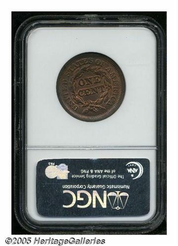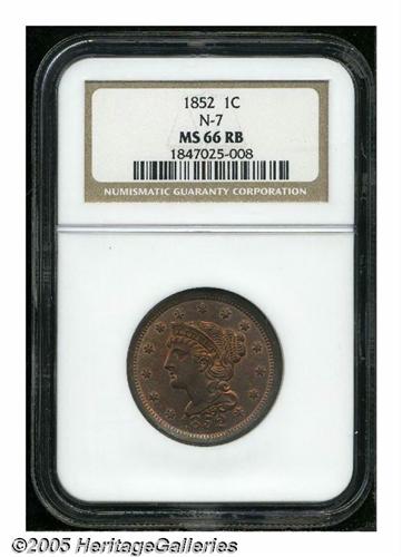 <B>1852<1C> MS66 Red and Brown NGC.</B></I> N-14, R.1, LDS. Attributed as N-7 by NGC, but the date location and other diagnostics do not comply. A lustrous example with blended gold and cherry color, some brown toning accompanies the borders. Well struck and attractive, a single spot at 10:30 on the reverse is far from the focal points.