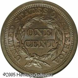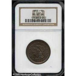 <B>1852 1C MS67 Brown NGC.</B></I> N-16, R.1. Minute mint-made die lumps on ONE CENT confirm the Newcomb variety. Only the fifth star is not crisply struck, and the remainder of the devices are well rendered by the dies. A virtually pristine Superb Gem that will satisfy even the most demanding specialist. Generally golden-brown in color, although ample hints of original Red are also present despite the Brown designation.<BR><I>From The Banks Collection.</B></I> Lot:5160