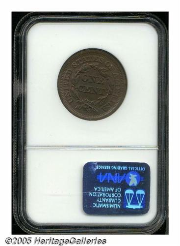 <B>1852<1C> MS67 Brown NGC.</B></I> N-17, R.1. A small die lump near the crossbar of the E in ONE aids attribution. The chestnut-brown surfaces retain hints of red color on the reverse. A boldly struck and impressively preserved Superb Gem that is distinguished by a tiny mint-made lintmark below the N in CENT. The highest certified of nine 1852 Cents certified by NGC as Newcomb-17.