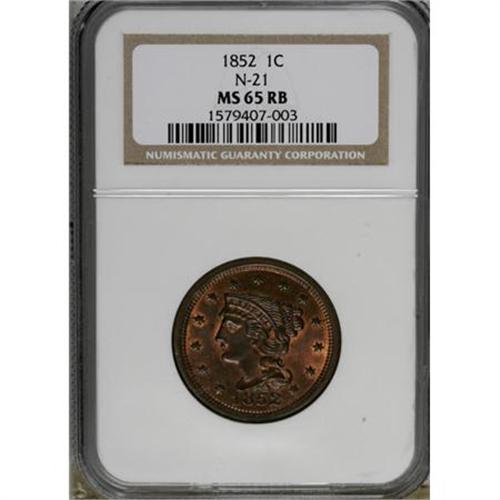 <B>1852 1C MS65 Red and Brown NGC.</B></I> N-21. NGC Census: (63/32). PCGS Population (63/5). Mintage: 5,063,094. Numismedia Wsl. Price for NGC/PCGS coin in MS65: $850. (#1899)<BR><BR><B>Coin Engraver:</B> Christian Gobrecht<BR><BR><b>Shipping:</b> Coins & Currency (<a target="_blank" href="http://www.heritageauctions.com/common/shipping.php">view shipping information</a>)