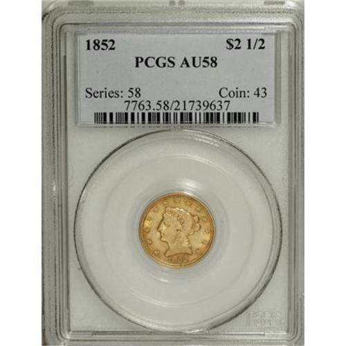 <B>1852 $2 1/2 AU58 PCGS.</B></I> PCGS Population (83/215). NGC Census: (152/435). Mintage: 1,159,681. Numismedia Wsl. Price for NGC/PCGS coin in AU58: $208. (#7763)<BR><BR><b>Shipping:</b> Coins & Currency (<a target="_blank" href="http://www.heritageauctions.com/common/shipping.php">view shipping information</a>)